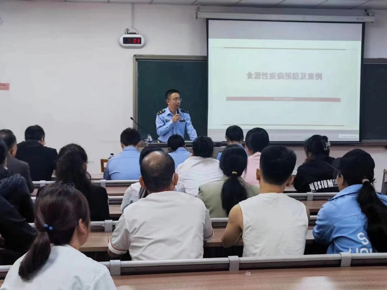集美市场监督管理所高军坡中队长为食堂员工开展食品安全培训,宣传学校食堂食品安全相关法律法规,专题讲解食源性疾病预防,为我校食堂食品安全工作保驾护航。