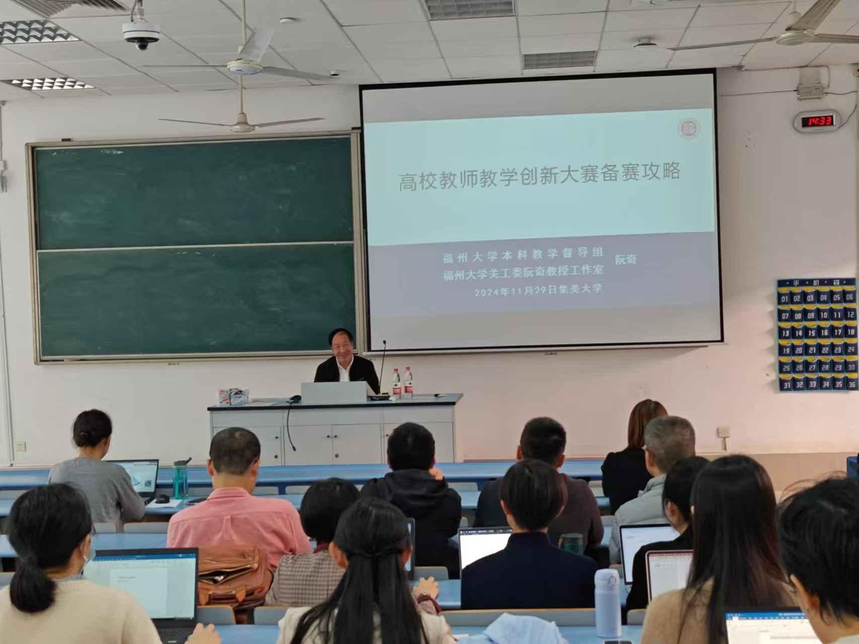 阮奇根据教师教学创新大赛文件精神和人才培养最新理念,结合教创赛成功案例,向与会教师详细阐述了课堂教学如何录制、教学设计如何创新、教学成果如何展示、如何备战教创赛等方面的相关策略与路径。