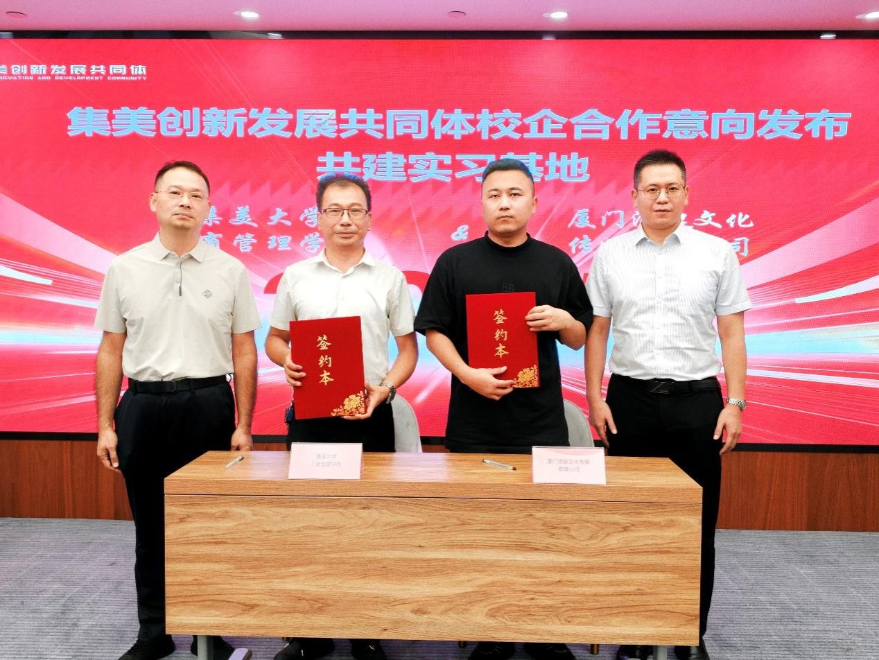 在集美区人力资源发展中心、校企代表以及集美创新发展共同体项目组的共同见证下,张仪华与厦门浪起文化科技有限公司合伙人郭银山分别代表双方单位签署共建实习基地协议。本次签约仪式的举行,标志着校企合作从“意向”走向落地。校企双方将通过联合共建实习基地,为学生提供真实企业实践场景,助力学生在沉浸式实践中,积累实操经验,切实提升实践作战能力与职场适配度。