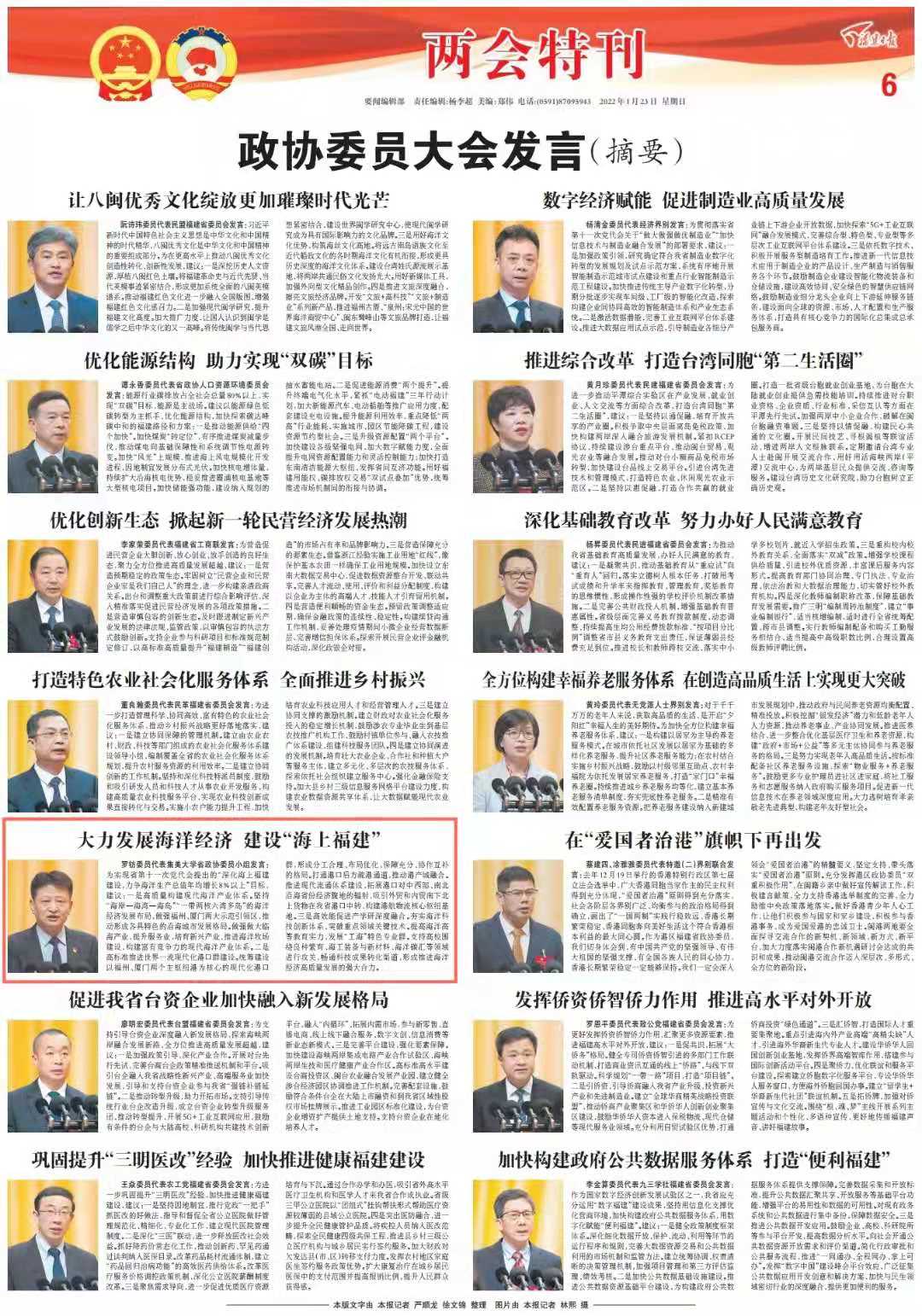 罗钫委员代表集美大学省政协委员小组发言:为实现省第十一次党代会提出的“深化海上福建建设,力争海洋生产总值年均增长8%以上”目标,建议:一是高质量构建现代海洋产业体系。坚持“海岸—海湾—海岛”“一带两核六湾多岛”的海洋经济发展布局,做强福州、厦门两大示范引领区,推动形成各具特色的沿海城市发展格局。做强做大临海产业,提升服务业,培育新兴产业,推进海洋牧场建设,构建富有竞争力的现代海洋产业体系。二是高标准推进世界一流现代化港口群建设。统筹建设以福州、厦门两个主枢纽港为核心的现代化港口群,形成分工合理、布局优化、保障充分、协作互补的格局。打通港口后方疏港通道,推动港产城融合。推进现代流通体系建设,拓展港口对中西部、南北沿海省份经济腹地的辐射,吸引外贸和内贸南下北上货物在我省港口中转,构建港航物流核心枢纽基地。三是高效能促进产学研深度融合。夯实海洋科技创新体系,突破重点领域关键技术。提高海洋高等教育实力,发展“工海”特色专业群。支持高校围绕良种繁育、海工装备与新材料、海洋碳汇等领域进行攻关,畅通科技成果转化渠道,形成推进海洋经济高质量发展的强大合力。